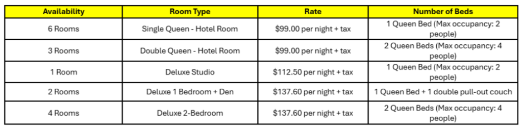 - 40 Deluxe King, single occupancy rooms have been reserved at a discounted rate of $179.00 per night + tax (GST) for May 5-8, 2026